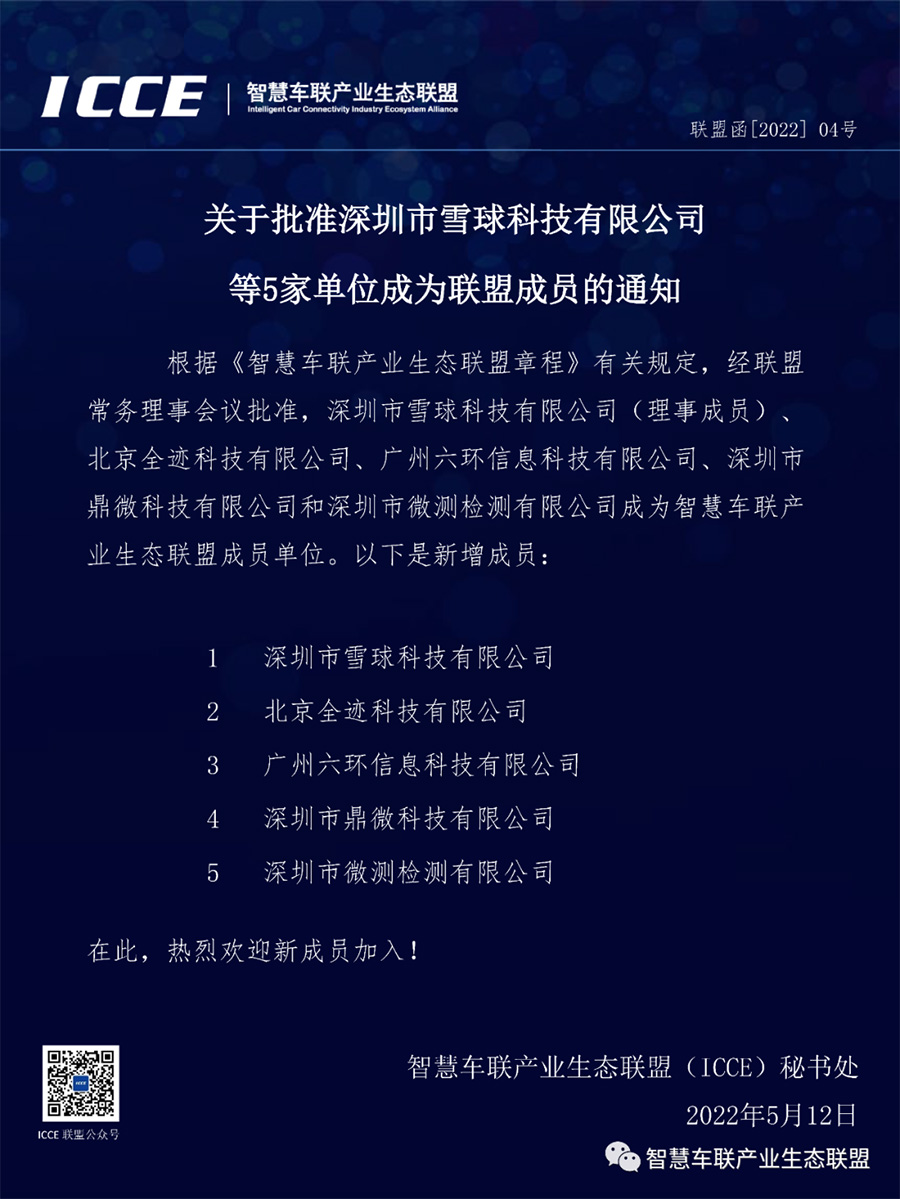 5月12日,經(jīng)聯(lián)盟常務(wù)理事會(huì)議批準(zhǔn),深圳市微測(cè)檢測(cè)有限公司、深圳市雪球科技有限公司、北京全跡科技有限公司、廣州六環(huán)信息科技有限公司、深圳市鼎微科技有限公司成為智慧車聯(lián)產(chǎn)業(yè)生態(tài)聯(lián)盟成員單位,發(fā)文如下: