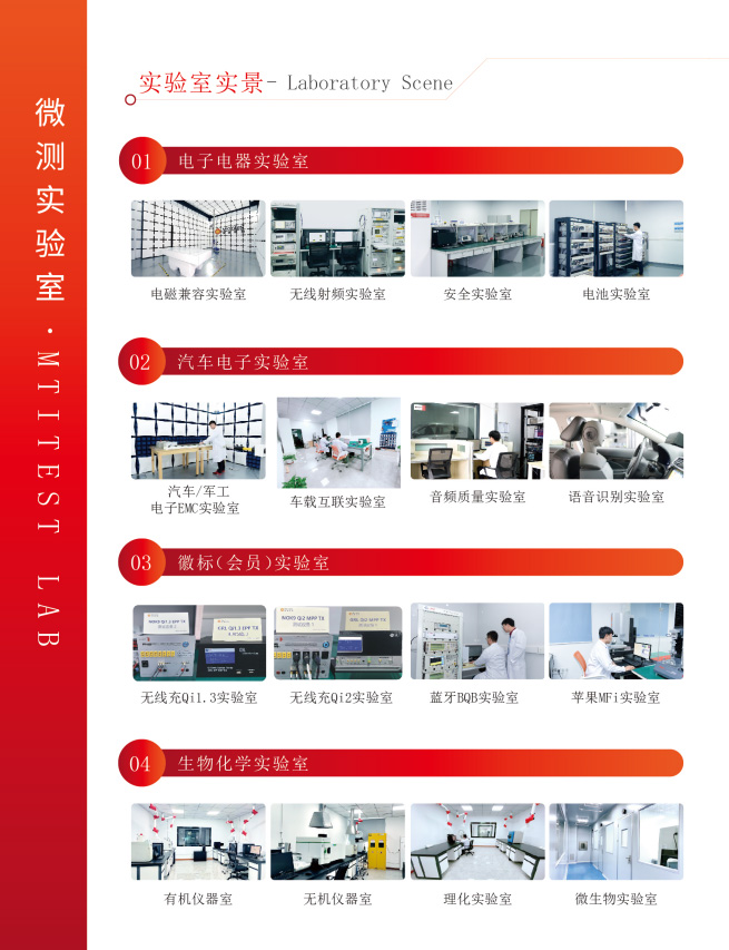 公司擁有20余個(gè)專業(yè)實(shí)驗(yàn)室,128人的工程師團(tuán)隊(duì),10000㎡檢測(cè)科技園,獲得了CNAS、CMA、A2LA、CBTL、WPC、Bluetooth SIG等授權(quán)和認(rèn)可。公司可為企業(yè)提供全球上百個(gè)國(guó)家的測(cè)試,包括華為HiCar、無(wú)線充Qi、藍(lán)牙BQB、蘋果MFi等眾多服務(wù)。無(wú)論企業(yè)身處何地,無(wú)論產(chǎn)品類型如何,微測(cè)檢測(cè)都能提供一站式解決方案,幫助企業(yè)順利進(jìn)入全球市場(chǎng)。